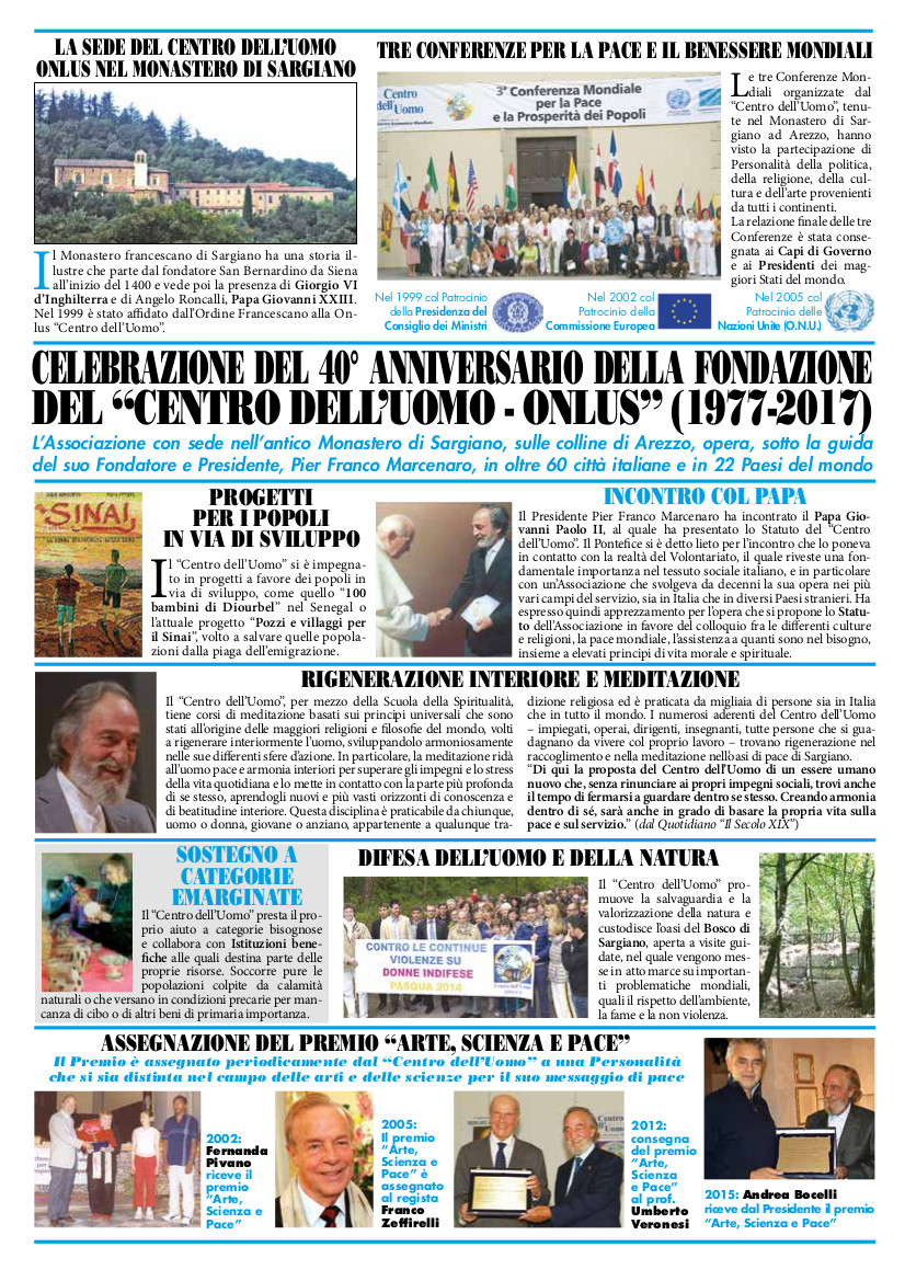 SARGIANO PEACE AT THE FOREFRONT Celebrations for 25 years of “Man Center”, an association that deals with major issues